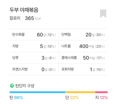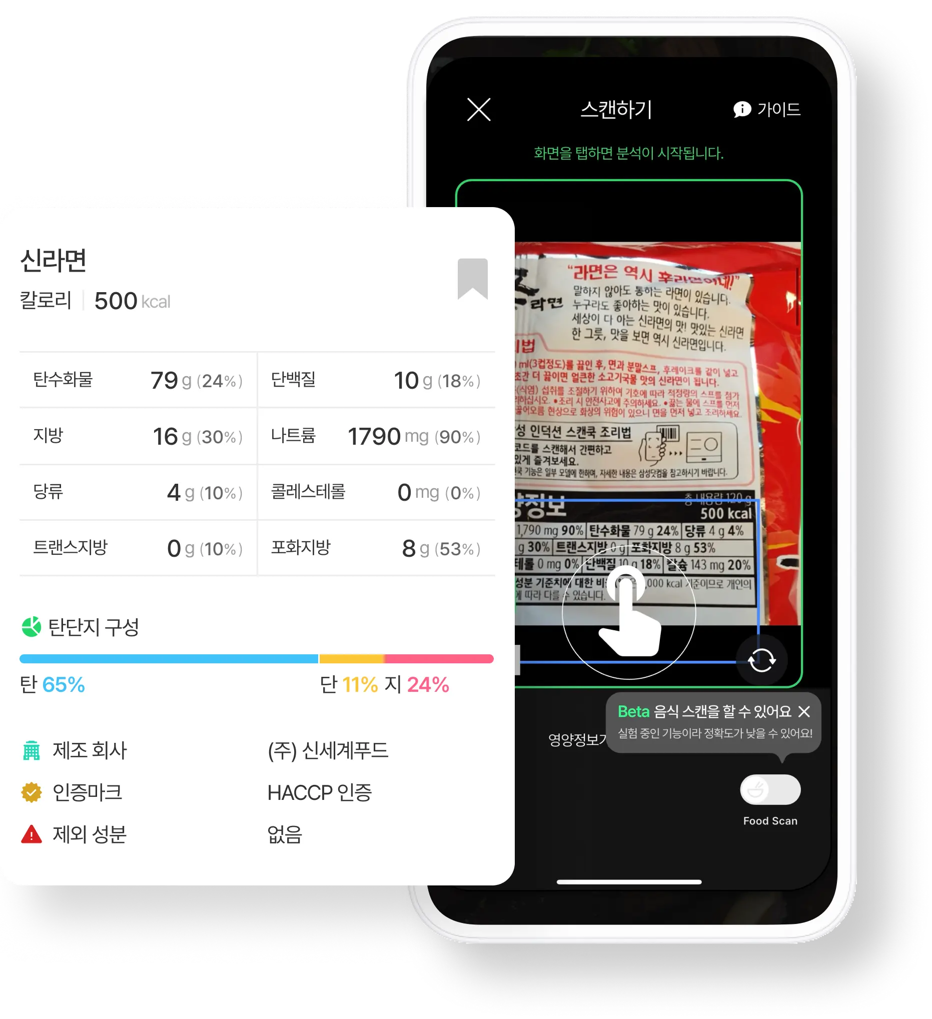 가공식품 뒷면의 1일 영양성분 기준치에 대한 비율이 아닌, 사용자님의 1일 영양성분 기준치에 대한 비율로 변환하여 제공해드립니다. 신라면의 뒷면 영양정보 상 탄수화물은 24%로 표기되어 있지만, 해당 영상의 사용자는 하루 탄수화물 섭취 목표가 282g 이기 때문에, 신라면 섭취 시 1일 탄수화물 기준치의 28% 로 변환된 점을 확인하실 수 있습니다. 이와 같이, 3대 영양소인 탄수화물, 단백질, 지방에 대한 기준치를 사용자님의 영양목표에 알맞게 개인화하여 제공해드립니다.
