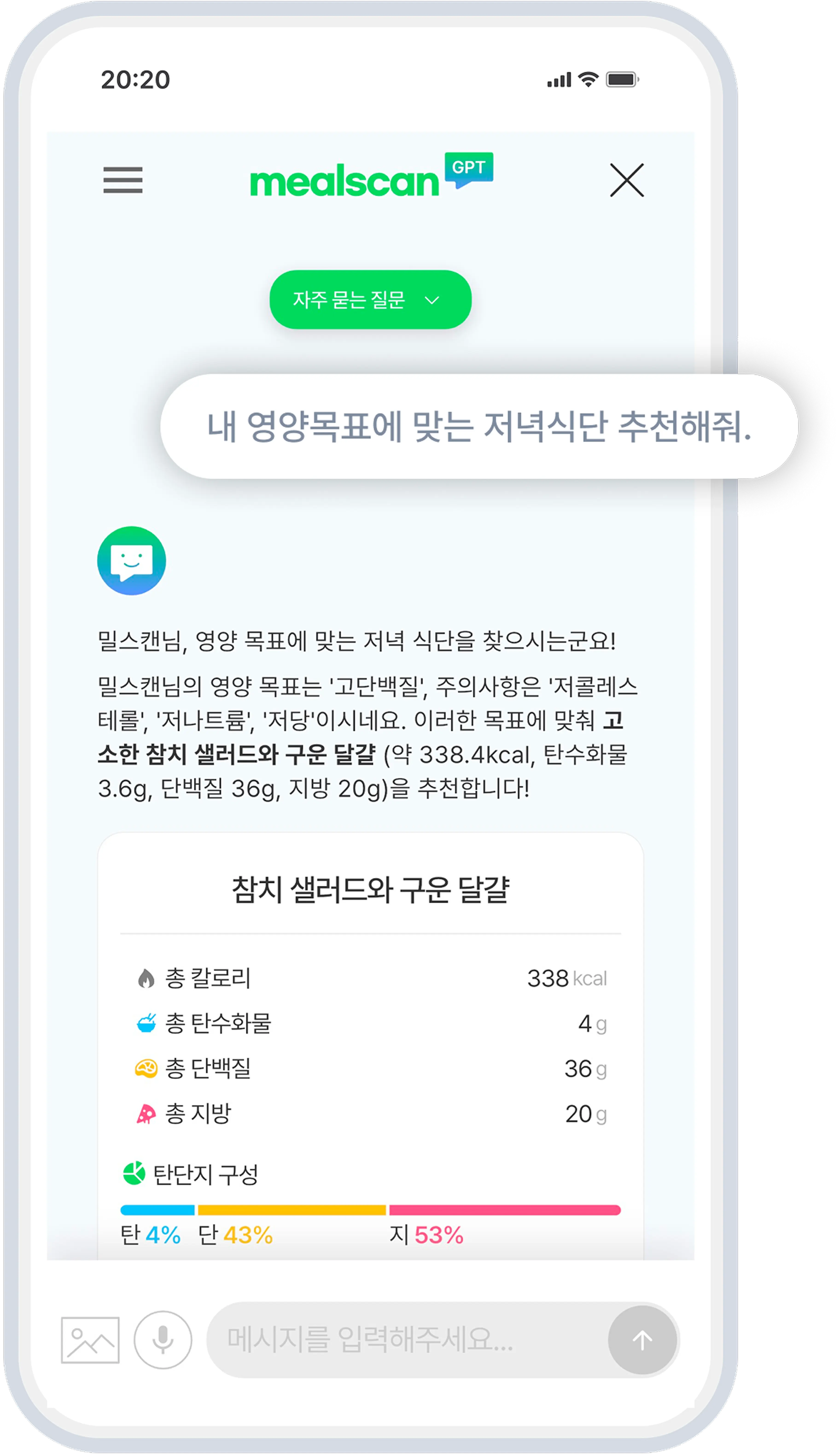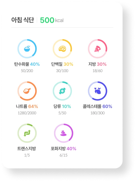 식단 만들기를 통해 음식을 추가하면서 실시간으로 변화하는 탄/단/지 비율을 확인하고, 내 목표에 가장 이상적인 식단을 만들어 실천해보세요.