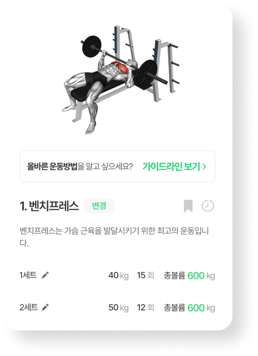 가슴, 등, 어깨, 하체, 복근 등과 같이 세부적인 운동 부위, 맨몸 운동, 머신 운동, 덤벨 운동 등과 같은 운동 방식 선택을 통해 손 쉽게 운동 가능해요.