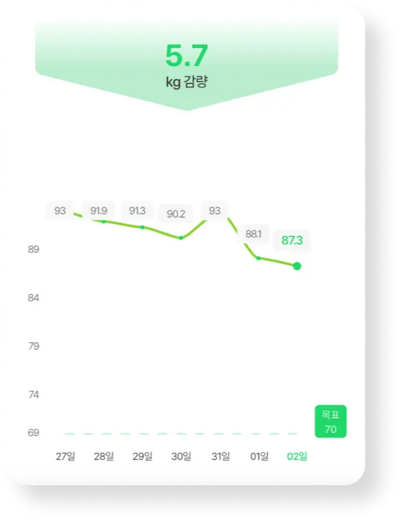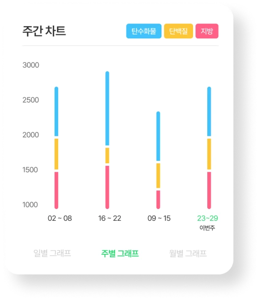 체중 입력 후, 간편하게 체중 변화를 알아보실 수 있는 그래프를 일간, 주간, 월간 단위로 제공해드려요.