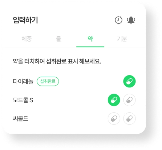 체중, 섭취한 물, 약 복용 입력을 통해 사용자님의 하루를 기록하고, 스마트하게 관리하세요.